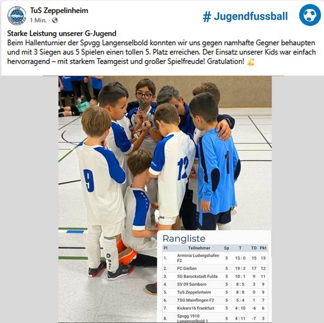Wir appellieren an euch, euch aktiv einzubringen und Teil dieser spannenden Entwicklung der TuS Zeppelinheim zu sein. Wir benötigen Helferinnen und Helfer für Veranstaltungen, engagierte Betreuer für unsere Jugendmannschaften, kreative Ideenbringer für neue Projekte und Menschen, die sich auf ihre eigene Art einbringen möchten. Egal ob ihr viel Zeit zur Verfügung habt oder nur gelegentlich helfen könnt - jeder Beitrag ist wertvoll und trägt zum Erfolg unseres Vereins bei.